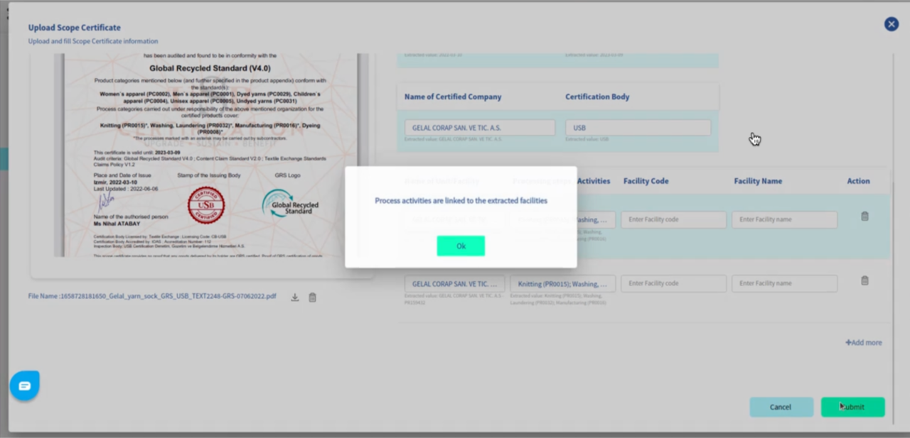 Platform is now enabled to link a scope certificate uploaded on the platform mandatorily to any of the Supplier’s facility. This will ensure that the scope certificate availability is also accounted for while calculating the supplier profile completeness score.